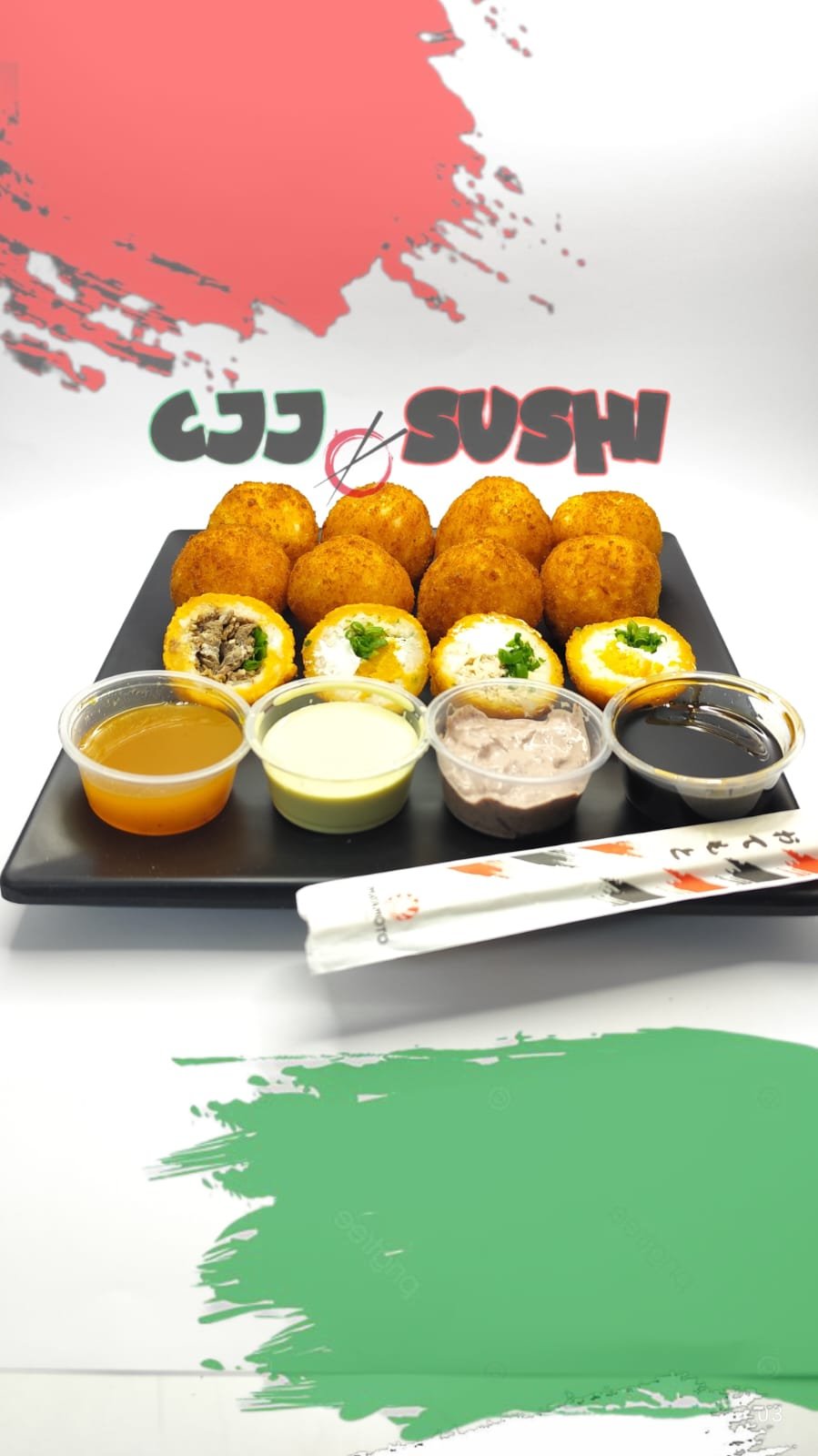 12 bolitas de arroz con base de queso crema y cebollín finamente picado, pasadas por tempura y panko, elije un relleno a elección de nuestra carta. Acompañada por 2 salsas soya o agridulce.